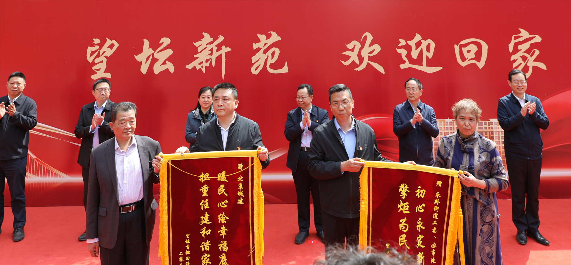 入住仪式上,居民代表与孙新军、陈代华、秦剑一同为望坛新苑小区揭幕,广大望坛居民期盼已久的“望坛新苑”,在现场嘉宾和居民代表的见证下正式揭开面纱。兴瑞公司总经理李克锐和永外街道工委书记张黎接受回迁居民赠送的锦旗。出席仪式的领导将代表开启美好幸福生活的“金钥匙”交至居民代表手中,祝各位街坊邻居在望坛新苑开启幸福美满的新生活。